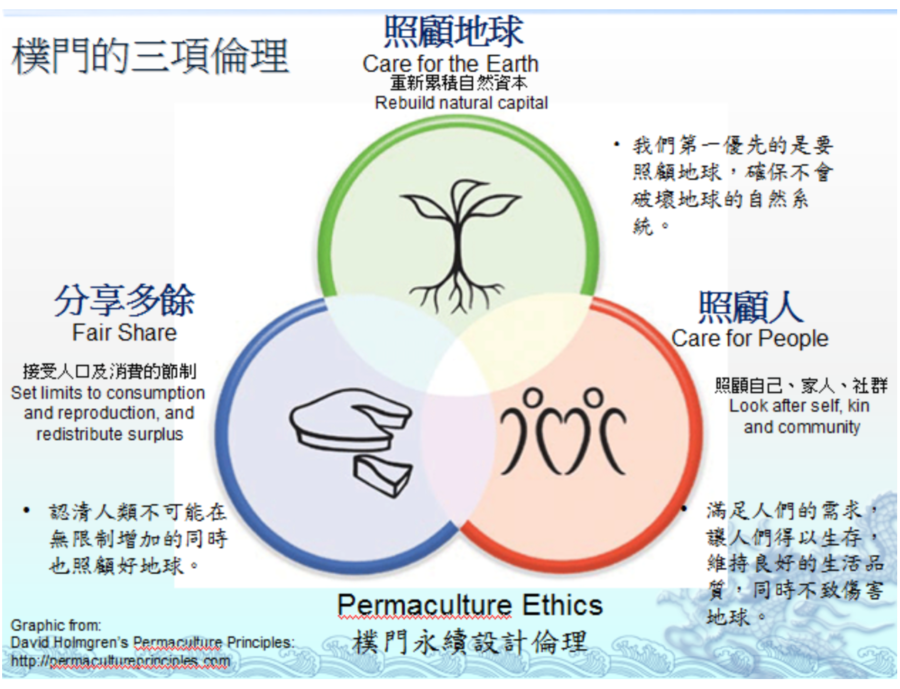 樸門的三大倫理(ethics)為 照顧地球(earth care)、照顧人類(people care)、分享多餘(fair share)。